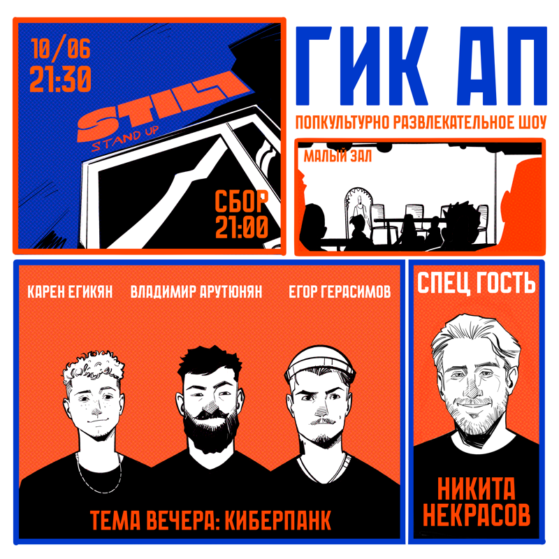 «Гик Ап» — это попкультурно-развлекательное шоу, созданное фанатами для фанатов. Трое комиков и один приглашенный гость продвигают в массы миры комиксов, манги, аниме, художественных фильмов и мультфильмов в комедийной форме.