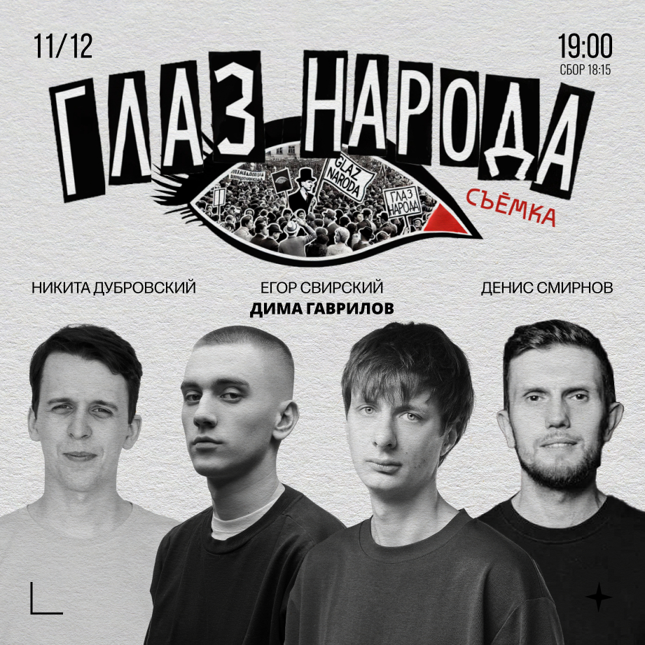 Никита Дубровский, Егор Свирский и Денис Смирнов снимают шоу «Глаз Народа», где комики проводят соцопрос на важные темы, волнующие народ. А потом обсуждают результаты вместе с участникам опроса, т.е. вами, уважаемые зрители!