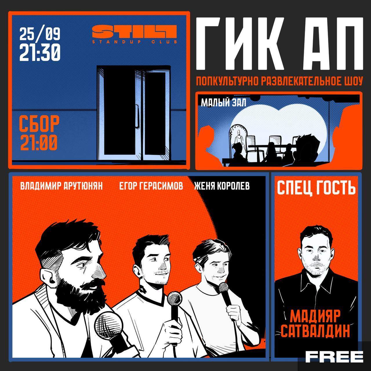 «Гик Ап» — это попкультурно-развлекательное шоу, созданное фанатами для фанатов. Трое комиков и один приглашенный гость продвигают в массы миры комиксов, манги, аниме, художественных фильмов и мультфильмов в комедийной форме.