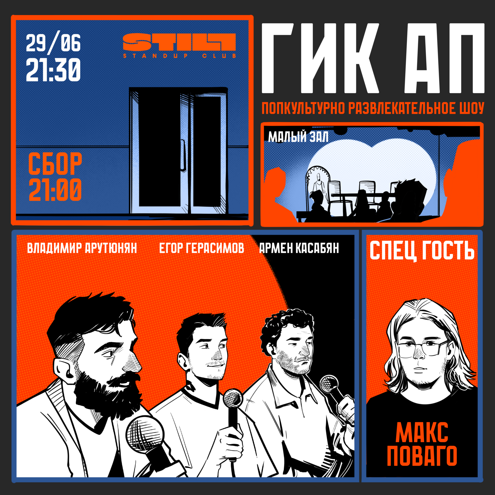«Гик Ап» — это попкультурно-развлекательное шоу, созданное фанатами для фанатов. Трое комиков и один приглашенный гость продвигают в массы миры комиксов, манги, аниме, художественных фильмов и мультфильмов в комедийной форме.