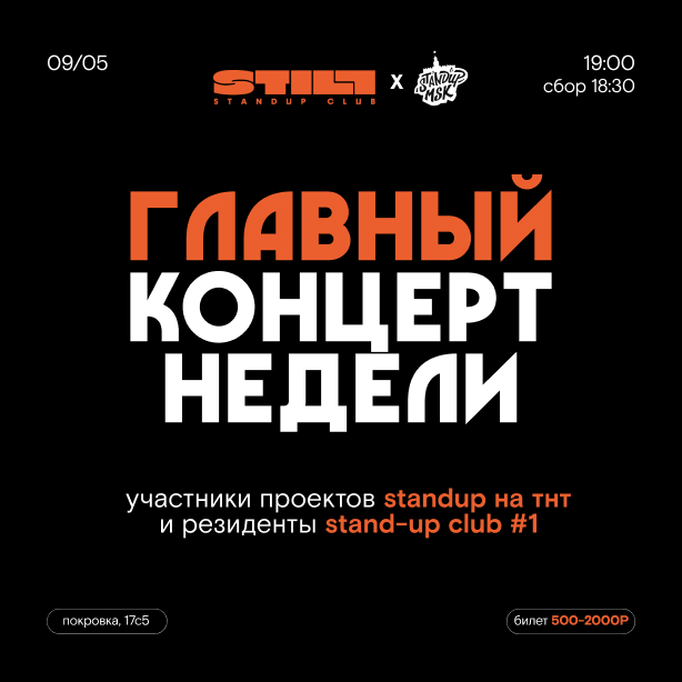 «Главный концерт недели» — это уникальный формат стендап-шоу от StandUp Msk. Состав скрыт. Это профессиональные комики, участники Stand-up на ТНТ, Labelcom, «Прожарка» и других популярных ТВ- и YouTube проектов.