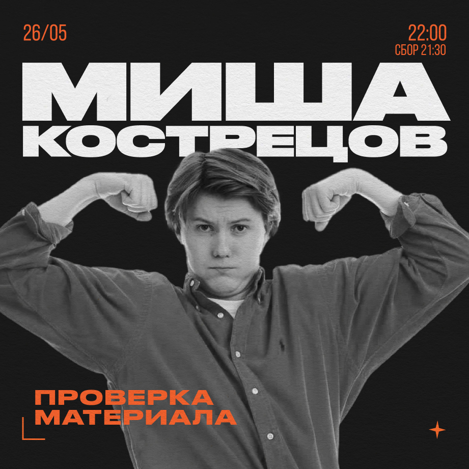 Миша Кострецов — резидент проектов «22 комика» и Outside Standup. Его шоу на 46% наполнено звуковыми эффектами и выразительной мимикой. Остальные 100% — это чистый смех. Возможно, вы подумали, что общее число переваливает за 100%, но не спешите — проценты взяты из разных категорий. Складывать их не стоит.